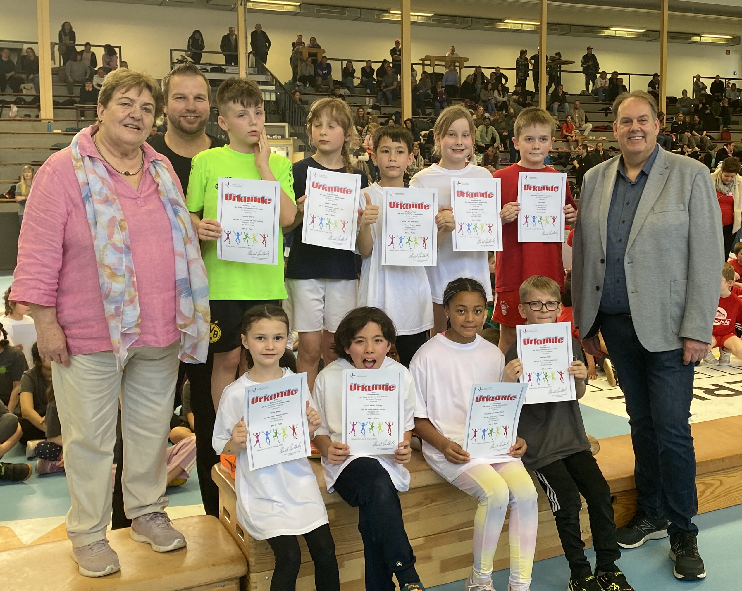 Mit viel Applaus wurden die Siegerinnen und Sieger des diesjährigen Wintersportfestes der Kamp-Lintforter Grundschulen am Donnerstag, den 26. Februar, in der Sporthalle Eyller Straße gefeiert. Die 252 Mädchen und Jungen der fünf Grundschulen waren zusammengekommen, um ihre Stadtmeisterin und ihren Stadtmeister zu ermitteln. In den Vorwochen konnten sich bei den eigenen Wintersportfesten aus rund 1.700 Schülerinnen und Schülern die jeweils 8 besten Mädchen und Jungen der Jahrgänge 2016 und 2017 sowie die jeweils 6 besten der Jahrgänge 2015 und 2018 für die städtische Veranstaltung qualifizieren.